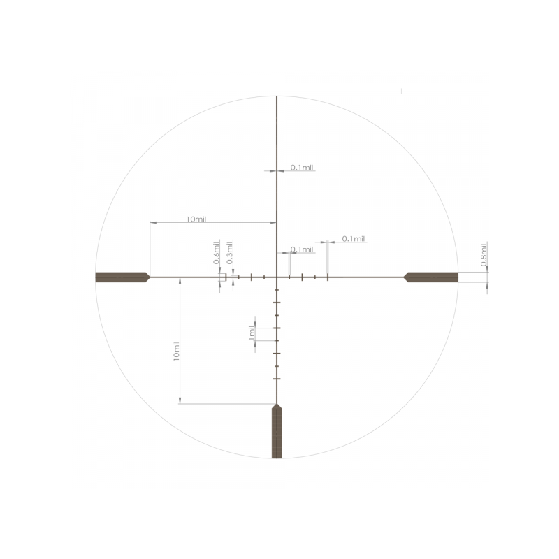 Прицельная сетка AMS1-10x представляет собой классическое перекрестие с вертикальными и горизонтальными маркерами для ввода поправок. Располагаясь во второй фокальной плоскости, сетка сохраняет неизменные масштабы на всем диапазоне кратности и исключает перекрытие даже мелкомасштабных целей.