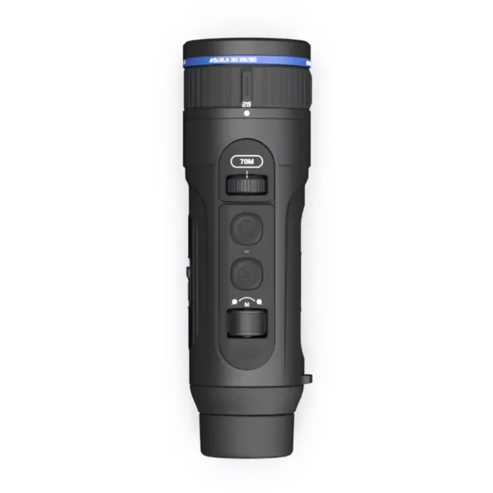Всепогодная компактная и эргономичная конструкция. Aquila 3D 25-50 — тепловизор «карманного» формата: компактный, с обтекаемым обрезиненным корпусом, удобно ложится в ладонь и умещается в кармане походной куртки. За счёт 100% пыле/водозащиты (класс IP67 допускает даже падения в воду на глубину до 1 м) и диапазона эксплуатационных температур -20/+50 °C, работать с тепловизором можно при любой погоде и в любой сезон. Для переноски есть кейс, для наручного ремешка — проушина рядом с окуляром, для установки со штатива — резьба 1⁄4“ снизу на корпусе.
