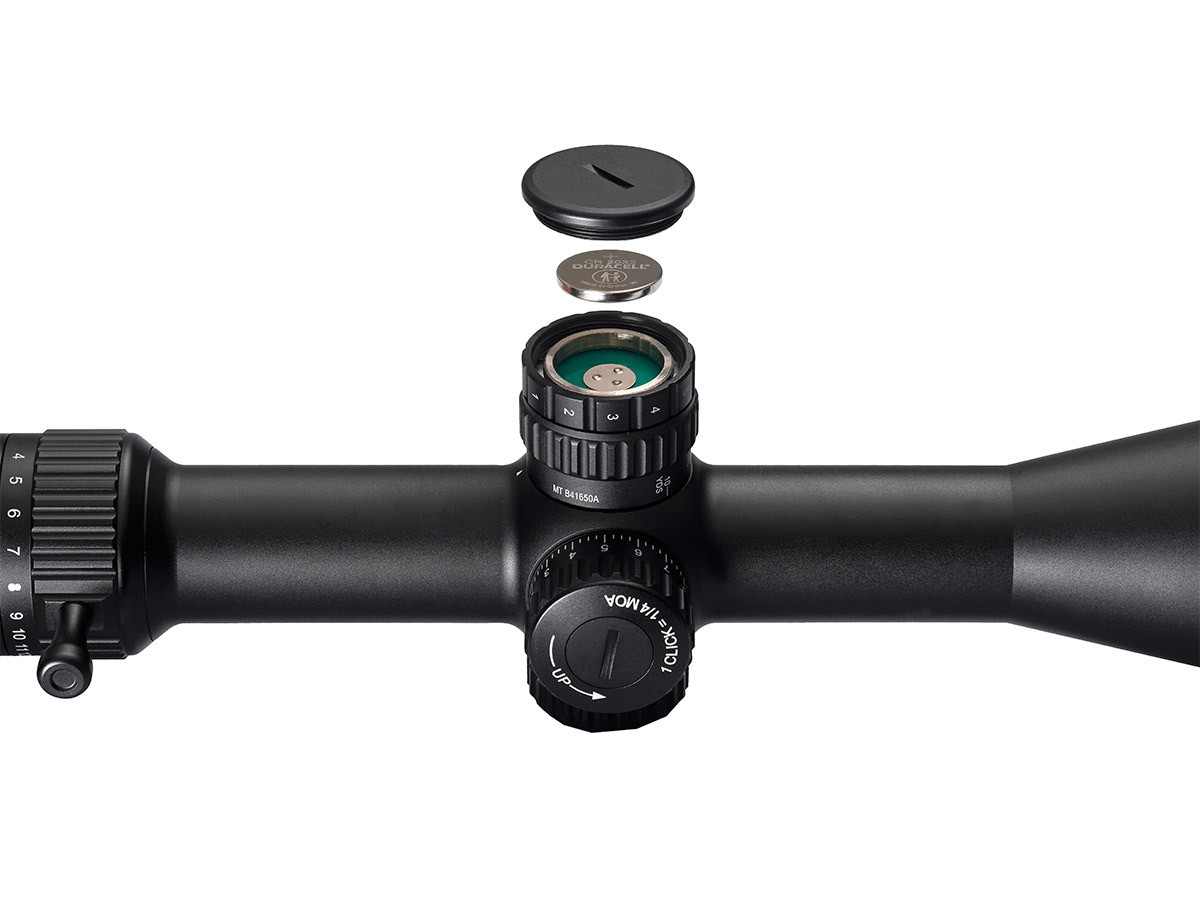 Барабанчики ввода поправок высокие и открытые. Блок подсветки расположен в средней части прицела и работает от батарейки типа CR2032. Подсветка имеет 11 уровней, что позволяет настроить её под любые условия. Подсвечивается центральная точка.